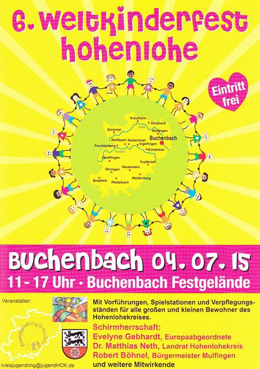 In diesem Jahr findet das bewährte Weltkinderfest Hohenlohe am Samstag, 4. Juli 2015, von 11 bis 17 Uhr auf dem Schulgelände der Geschwister-Scholl-Schule in Künzelsau-Taläcker statt. Der Kreisjugendring Hohenlohe hat in Zusammenarbeit mit Landratsamt Hohenlohekreis ein buntes Programm zusammengestellt.
